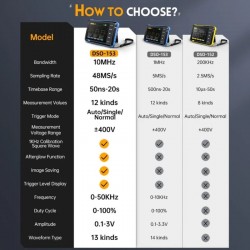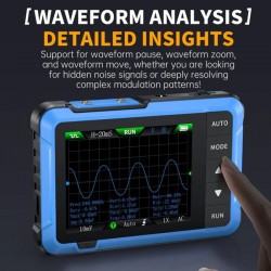 În plus, are un generator de semnal integrat cu frecvență de ieșire de 50 kHz, oferind posibilități variate de testare. Ecranul HD LCD de 2,8" cu rezoluție 320×240 oferă vizualizare clară, iar bateria litiu de 1000mAh asigură până la 4 ore de utilizare continuă.
